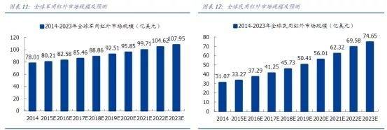 军用红外领域:红外热像仪应用广泛。红外热像仪具有隐蔽性好、抗电磁干扰能力强、识别能力强、能获得目标的状态信息、能全天候工作等优势,因此被广泛应用于军事领域。根据MaxtechInternational及北京欧立信咨询中心预测,2023年全球军用红外市场规模将达到107.95亿美元。近年红外热像仪在我国军事领域应用快速提升,包括单兵、坦克装甲车辆、舰船、军机和红外制导武器在内的红外装备市场将迎来快速发展阶段。