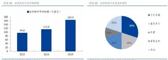 全球靶材行业市场空间大且呈寡头垄断格局,未来国产化率有望提升。2019年全球靶材行业规模高达163亿美元,主要集中在美日的几家企业,行业集中度高。国产化率处于低点,给国内技术领先的靶材企业提供了巨大的成长空间。先导薄膜可以提供高性能的ITO靶材,以及高纯度的金属靶,包括铝、铜、钼和钛,将直接受益于平板显示、半导体、太阳能等行业的高速发展及国产替代。