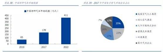 特种气体作为新兴产业发展不可或缺的关键性材料,其市场规模将保持高速发展。2017年国内特种气体市场规模达到178亿元,其中半导体领域的市场规模约100亿元。预计2017-2022年中国特种气体市场规模CAGR为18.22%,2022年市场规模将达到411亿元。先导稀材可提供高品质的电子气体,应用于LED制造、光伏太阳能、光纤和微电子器件。公司电子气体包括砷烷、磷烷、硒化氢、锗烷,广泛应用于半导体加工制造,例如薄膜沉积-包括化学气相沉积(CVD)和物理气相沉积(PVD)。