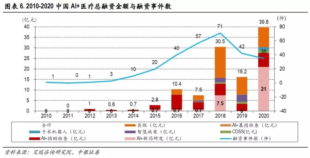 正因如此,即便2020年我国AI+医疗领域融资事件数有所减少,但融资总额反而走高,接近40亿元人民币,AI+新药研发是其中最热门的领域,融资金额超过20亿元。