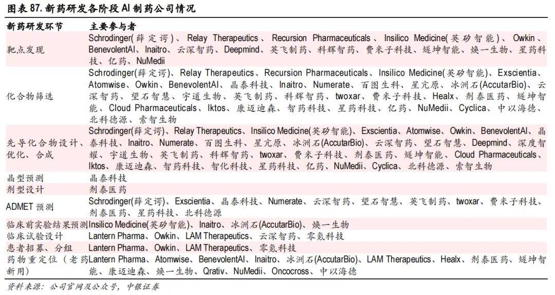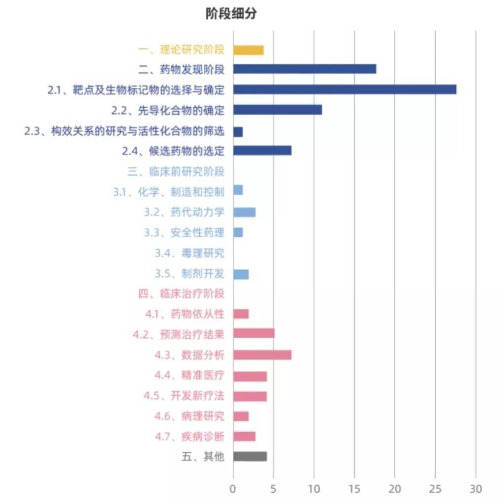 - 药物发现:该阶段包括靶点选择优化、先导化合物的发现、化合物的筛选。