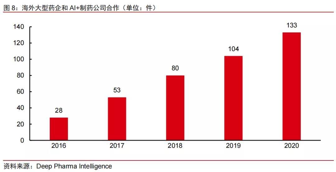 另外值得注意的是,全球医药巨头和AI+新药研发的公司合作事件逐年攀升,据不完全统计,2020年合作数量超过133件。