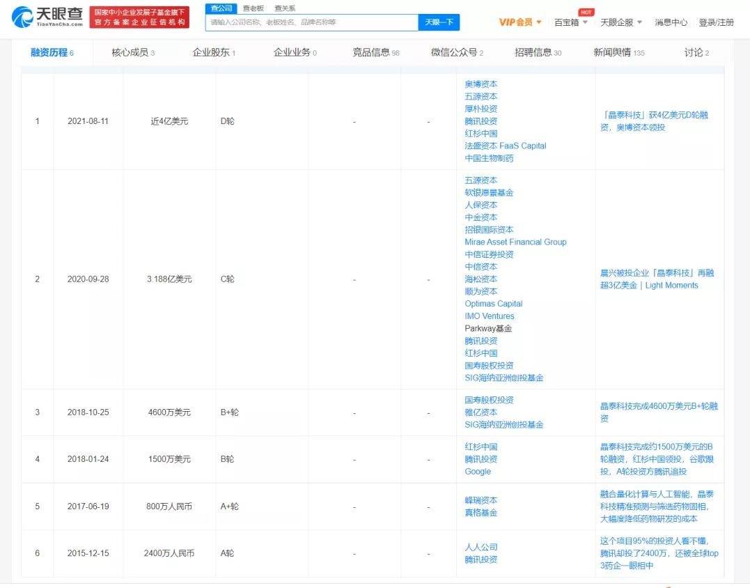 据天眼查数据显示,晶泰科技2015年成立至今,已累计完成6轮融资,投资者包括谷歌、腾讯、软银、红杉资本、奥博资本、国寿股权投资、SIG 海纳亚洲、人保资本、晨兴资本、中金资本等,投后估值超过130亿元。