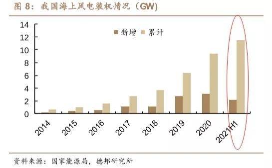 2021年之后,尽管陆上抢装之后整体风电装机需求上半年同比有所回落,但目前仍处于历史高位。反而今年随着海上风电的高补贴时代也临近尾声,平价化趋势迹象也导致以海上风电为主的装机有所升温。预计2021年将是海上风电继去年陆上风电之后创记录的一年。