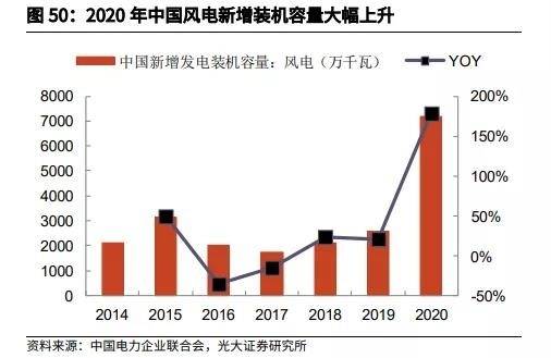 从数据看,2020年我国风电新增装机容量72GW,同比增长179%,创出历史以来新高,其中陆上风电装机69GW同比增长188%,海上风电装机3GW,同比增长53%。
