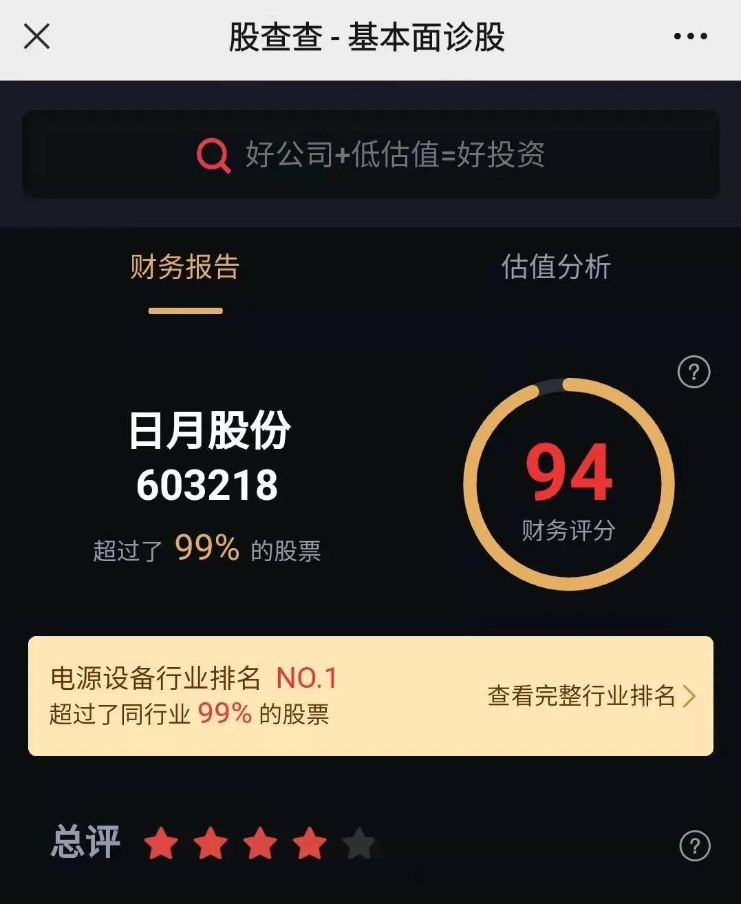 总的来说,公司基本面还是比较优秀的,几乎不存在太过特别的风险,因此给予财务评分94分,再结合目前的估值优势,在股查查诊股系统里得到了总评4星表现。