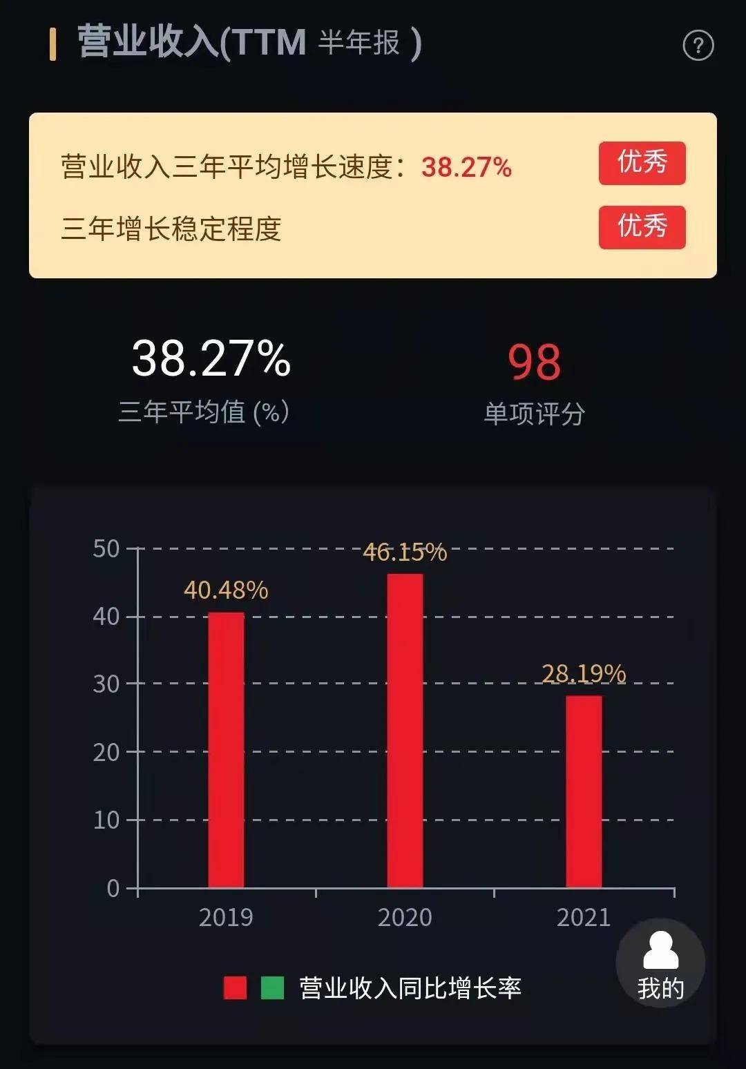 从经营看,再分拆各项财务评分指标,营业收入(TTM)给予单项评分为98分。主要是最近三年公司营收平均增长速度达到38.27%,同时历年增速稳定程度表现优秀。