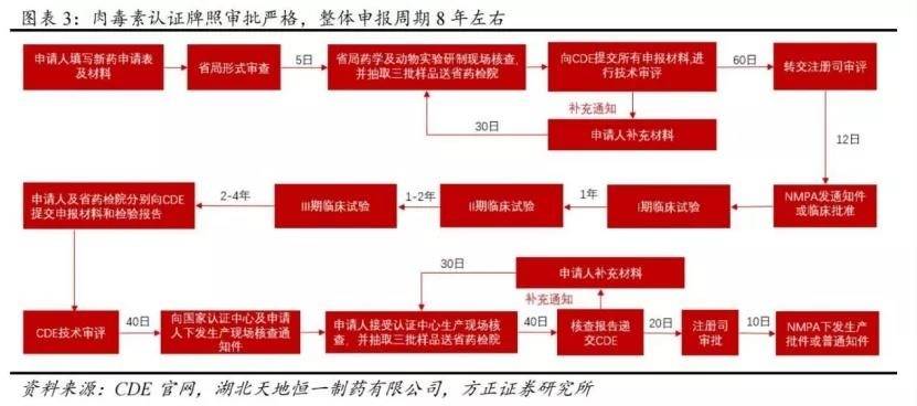 肉毒素认证牌照审批严格,整体申报周期8年左右。例如爱美客负责韩国Huons公司的肉毒素产品Hutox在中国的临床试验及注册申请,募投项目显示建设工期长达65个月。