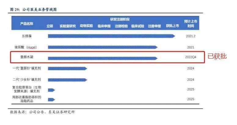目前,公司拥有超过10款医美自研管线,包括少女针、童颜针、童颜水凝、溶脂产品、胶原蛋白类产品等,目前公司自研的童颜水凝已于2021年9月获批,自研减脂产品利拉鲁肽准备进入临床III期研究,多款重磅新产品将于五年内进行注册申报,形成强大产品矩阵。