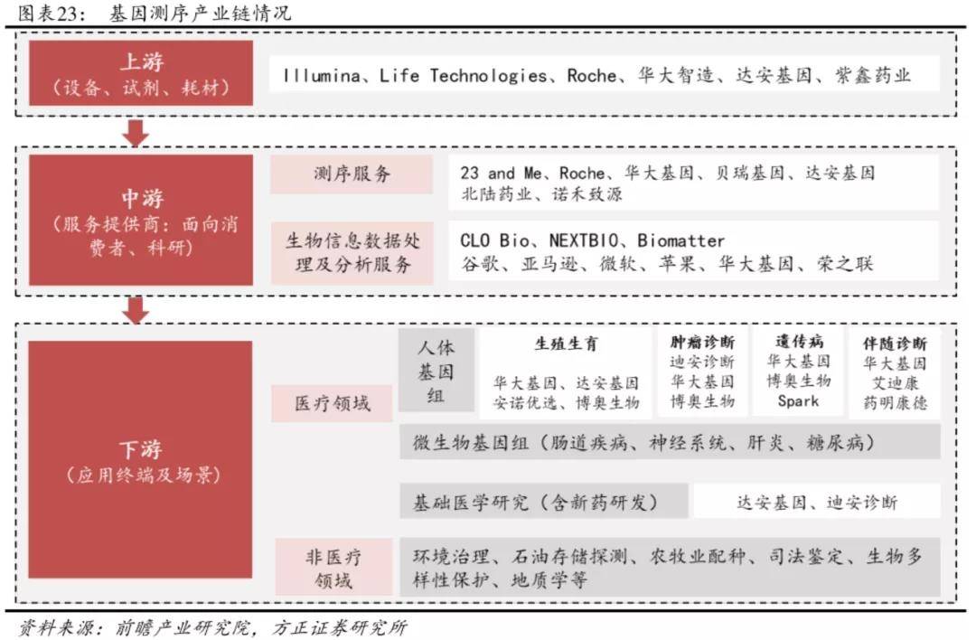 基因测序产业链分为上游仪器试剂、中游服务提供商和下游终端应用三个环节,其中(下图)不难判断:上游的技术壁垒较高。