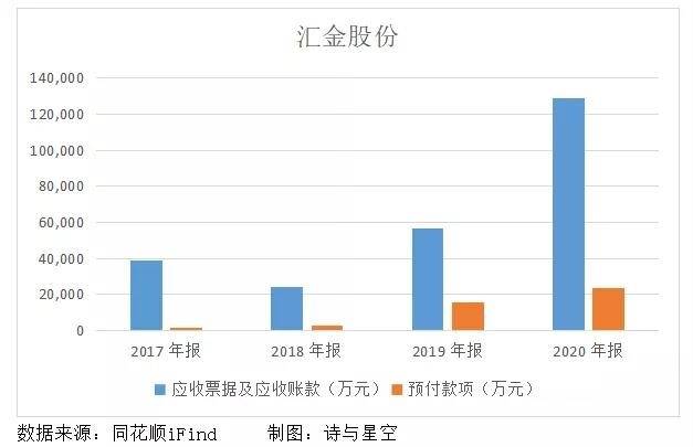 2019年,汇金股份以 1.17 亿元收购控股股东邯郸建投持有的青岛维恒100%股权、河北兆弘100%股权、山西鑫同久60%股权,把控股股东的供应链业务注入上市公司,导致应收账款和应收票据同比增长136%,预付款项同比增长415%。