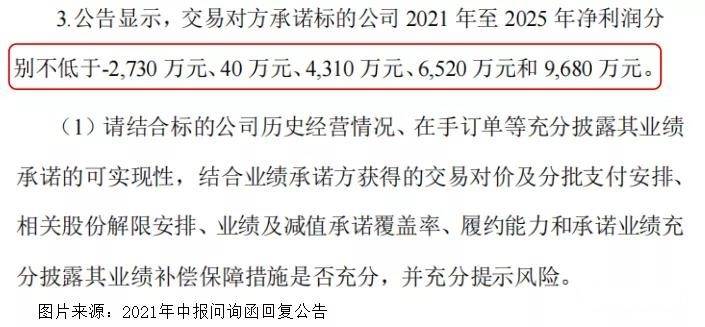 承诺业绩波动极大,2021年不低于-2730万也是令人大跌眼镜。标的公司是否有能力履行承诺业绩目标,若不能,争议如何解决?另外,还存在多个可疑科目,要求审计提供详细说明。