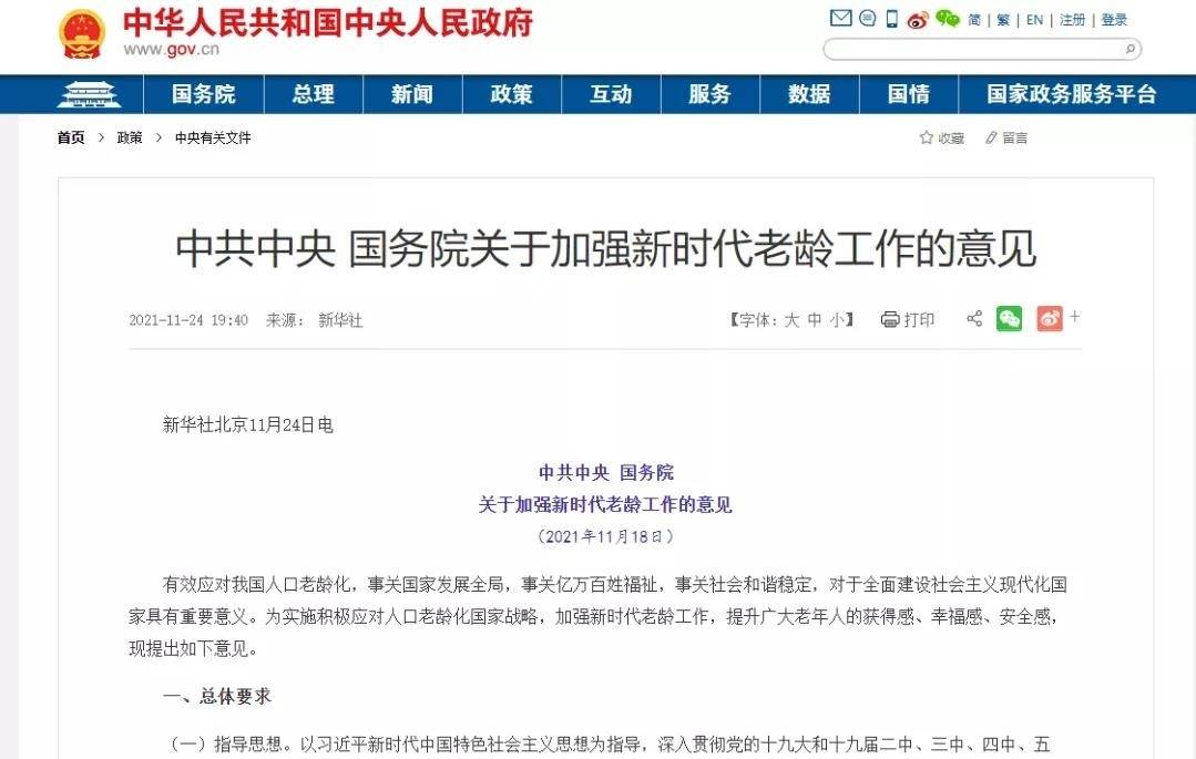 10月24日晚间,中共中央、国务院发布关于加强新时代老龄工作的意见。