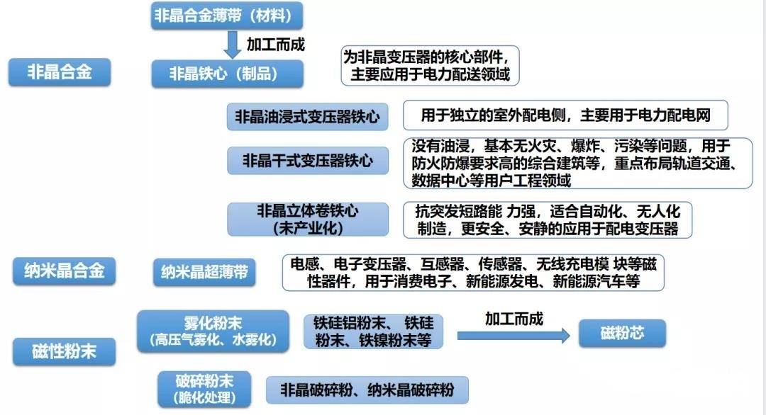 公司主要产品有非晶合金薄带及制品非晶铁心、纳米晶超薄带、雾化和破碎粉末及磁粉芯等,公司产品具体如下图: