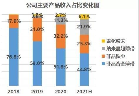 而纳米晶合金和磁性粉末主要应用于中、高频环境的电子磁性元器件,最终应用于消费电子、新能源发电、新能源汽车、家电、粒子加速器等新兴行业领域。近年来随着纳米晶薄带、雾化粉末等相继量产,公司产品用于电子磁性元器件收入占比从2018年的5%大幅提升至2021年上半年的30%左右。