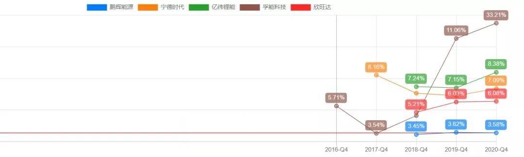 之所以今天覆盖孚能科技,除了因为它是软包电池龙头,也是因为此前咱们覆盖鹏辉能源的时候,对比过几个主要锂电池上市公司的研发费率情况,孚能科技的研发费率走势逆天,冠绝行业。
