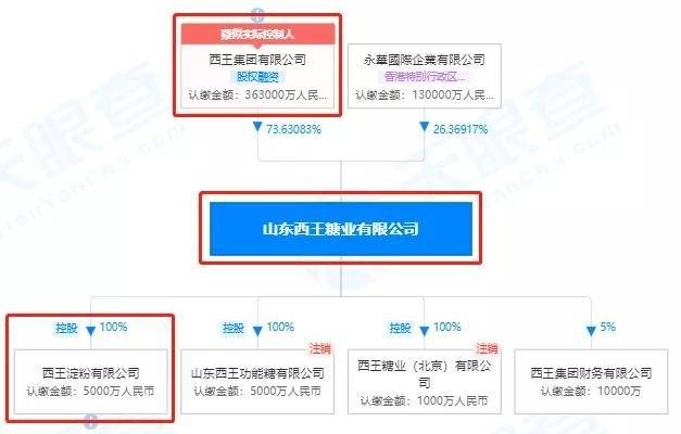 天眼查显示,西王淀粉由山东西王糖业有限公司100%控股,此外西王糖业又由西王集团有限公司控股,这正是西王食品的控股股东。