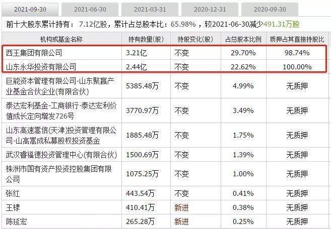 截至2021年9月底,公司控股股东西王集团及其一致行动人山东永华投资有限公司所持西王食品占总股本比例52.32%的股权,几乎全数处于质押状态。