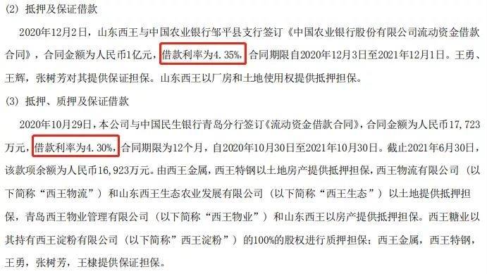 财报显示,2020年12月2日,山东西王与中国农业银行邹平县支行签订《中国农业银行股份有限公司流动资金借款合同》,合同金额为人民币1亿元,借款利率为4.35%。