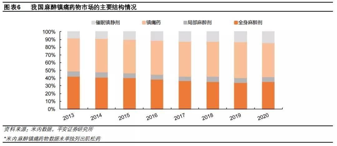 其中,麻醉剂和镇痛药是最大的两个细分,合计占据整个市场的85%以上,镇静催眠药近7年的复合增速超过22%。