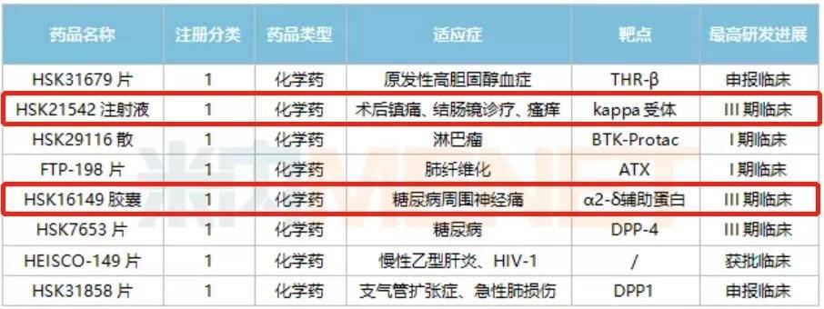 HSK-21542主要有两个适应症,一是术后镇痛,对标的是临床常见的芬太尼、地佐辛等阿片类镇痛药。二是瘙痒适应症,对标的是纳呋拉啡(国内三生制药引进日本东丽,已报产),但纳呋拉啡能进中枢,中枢副作用不能避免,HSK-21542不存在这些副作用。