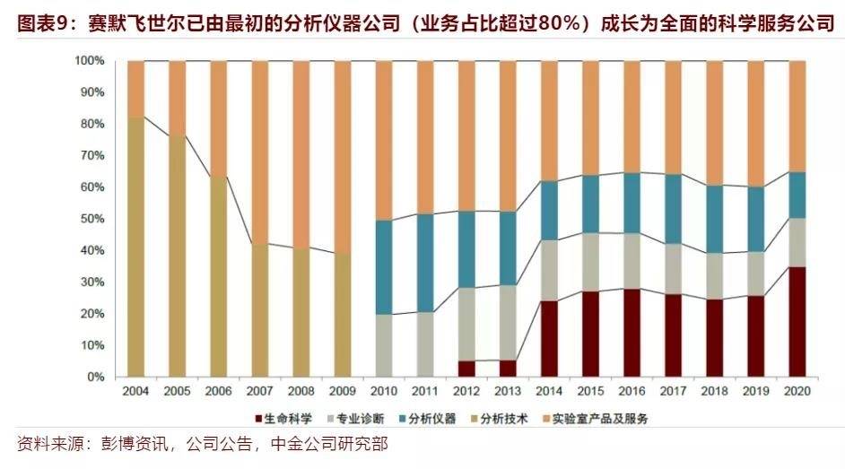 从当今生命科学巨头赛默飞世尔的发展路径来看,从最初的分析仪器公司,通过创新+并购等方式,在仪器领域形成全面产品矩阵及核心竞争力,向下游及其他领域如试剂、耗材、服务等市场扩张,进而成就全球性的科学服务龙头。