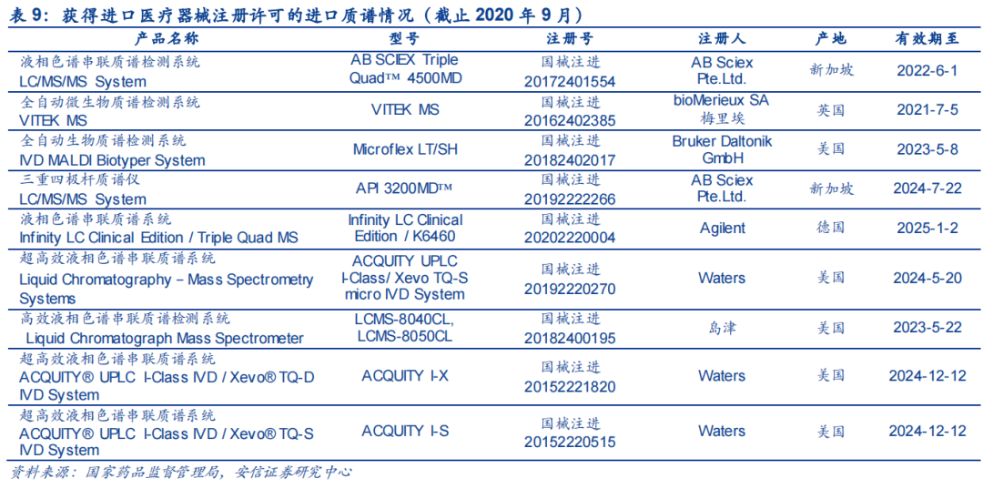 另外可以从进口注册和国产注册质谱类型情况进行交叉印证,据安信证券统计,近期国内已获得临床医械II类注册许可的产品共计15项,三重四极杆液质和飞行时间类包揽了其中的14项,其中三重四极杆液质均为OEM贴牌。