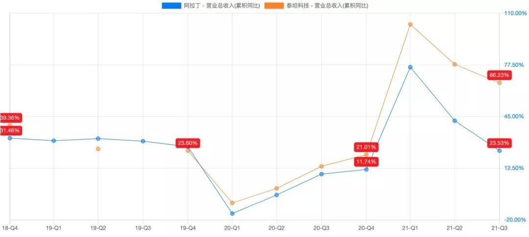 不过平台模式的好处就在于,用户可以一站式购物,要买啥找一家企业就够了,上面的SKU可以相互引流,所以整体来说,泰坦的增速是要高于阿拉丁的,其增速线条一直在阿拉丁的上方。