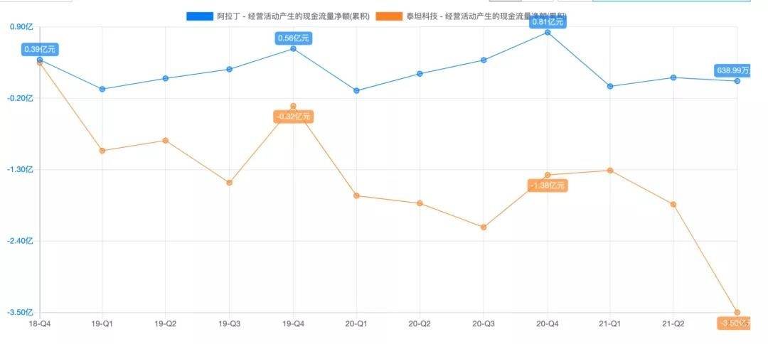 从企业的命脉现金流来看,泰坦的现金流一直为负,且随着上市后业务的急剧扩张,泰坦负得越来越多,而阿拉丁模式就在于现金流一直为正,且能稳健增长。