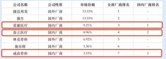 在我国关节植入医疗器械前五大厂商分别为捷迈邦美、强生、爱康医疗、春立医疗、林克骨科,其中春立医疗为我国第二大关节类植入医疗器械本土企业,在所有厂商中位居国内第四,国内市占率8.96%,相比之下爱康医疗位居国产厂商第一,市占率为9.21%,威高骨科市占率为3.53%。