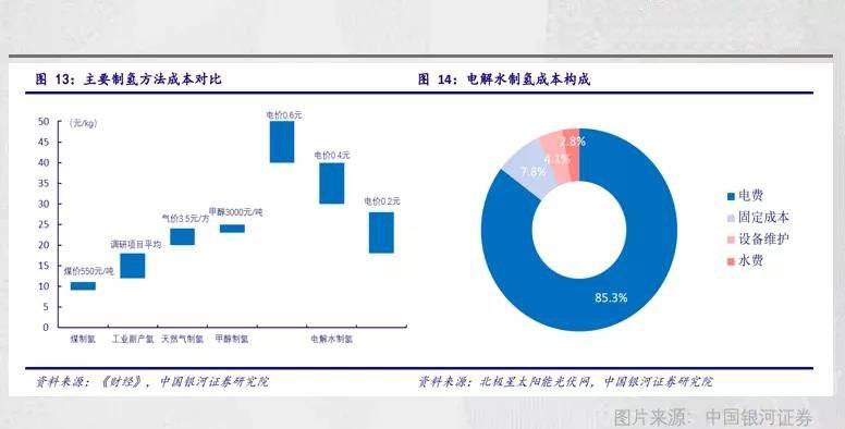 “绿氢”面对的最大问题就是成本,现阶段主流的碱性电解水制氢技术,这种技术最大的问题在于能耗较高,电费占到了制氢总成本的85%。据《财经》测算,当工业电价降至0.3元时,碱性电解水的成本将会与其他制氢路线相当,才具有经济效应。