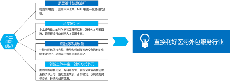 回顾过去我国医药行业的历史进程,之所以近年来医药外包行业得以快速发展,主要原因在于政策推动(MAH制度、审评审批制度的改革等)、创新药迎来黄金时代、中国科学家和工程师红利,以及全球产业转移等。其中,自2015年以来实施的一系列鼓励创新药政策,影响了我国创新药从研发到上市各个环节。