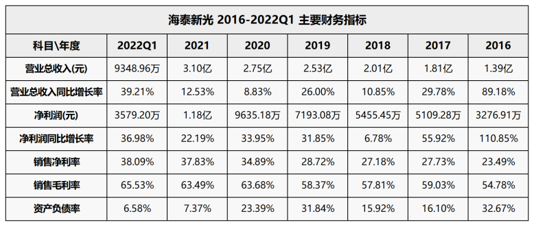 回顾往年业绩,海泰新光一直保持稳健增长态势:总营收从2017年的1.81亿元增长至2021年的3.1亿元,五年复合年增长率为11.36%;同期,净利润从5109万元增长至1.18亿元,CAGR为18.22%。