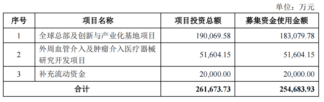 在25.47亿的募资额中,18.3亿元用于全球总部及创新与产业化基地项目投资,占募资总额的72%,后续项目将新建生产研发大楼,预计达产后将形成年产量80万根/瓶主动脉、外周血管及肿瘤介入医疗器械产品的生产规模。
