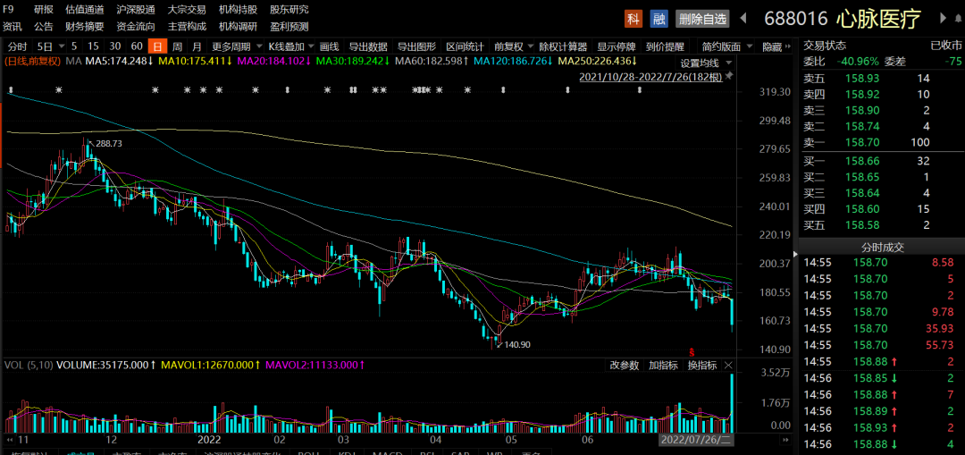市场投资者面对突如其来的巨额定增案,并未买账,心脉医疗股价低开-1.2%,随即一路下行,截止收盘大跌11.1%。