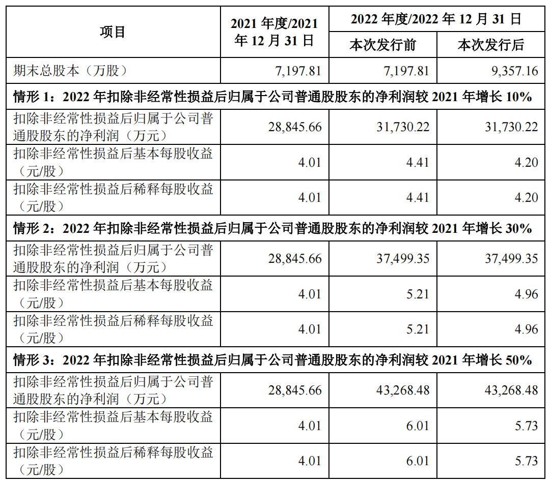针对这个问题,心脉医疗也很“暖心”,在发行股票的预案里做了一个测算,利用公司净利润增长10%、30%、50%的三个档位假设对于每股收益摊薄的影响。