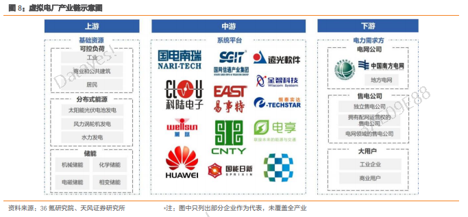 我们可以看看虚拟电厂产业链,它包括:上游基础资源、中游系统平台和下游电力需求方。