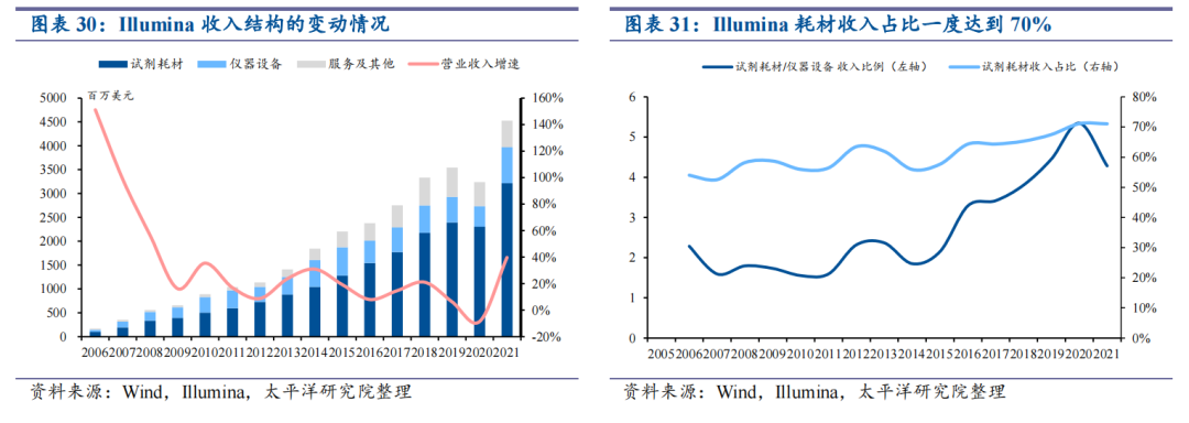 拆解illumina的营收结构,不难发现公司主要收入来源于试剂耗材,自2014年开始相关收入一路攀升,占整体收入比重一度达到70%,这得益于测序仪“封闭式”的商业模式,在哪家测序仪上操作测序,需使用该品牌型号配套的试剂耗材,不同品牌型号的试剂耗材无法混用。