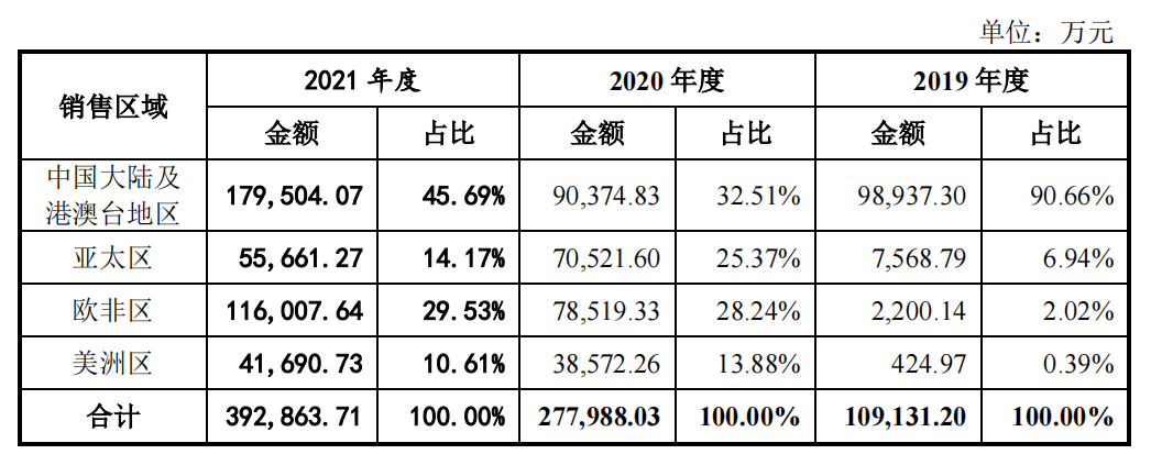 先从华大智造的营收地区分布来看,在疫情之前,公司十分依赖国内市场,2019年收入占比达到90.66%。近两年国内占比的下降,得益于疫情发酵,相关的自动化样本处理系统、实验室自动化流水线和样本处理试剂耗材等产品出口大幅增加。