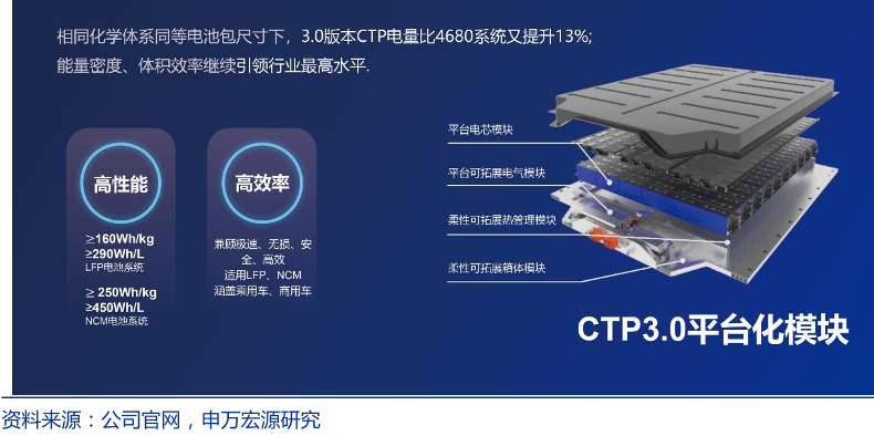而现在说的CTP3.0,其本质是进一步去掉箱体上的纵梁或横梁,利用两个电芯之间的水冷板和电芯本体来实现结构上的需求,预计这款电池的续航可以达到800km+。