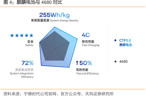 当麒麟电池采用磷酸铁锂时,系统能量密度超过160Wh/kg、290Wh/L;采用三元体系时,系统能量密度可以做到250Wh/kg、450Wh/L。