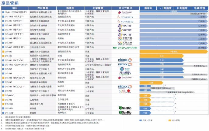 1)OT-401(氟轻松玻璃体内植入剂,商品名称:优施莹®):NDA已于2022年6月正式获CDE批准用于治疗慢性NIU-PS及在中国商业化,是公司管线中首款在中国获批上市的新药。公司这款产品利用了真实生成数据的创新路径,获批时间是3年多(一般从引进到获批的平均时间是6-7年),大大缩短了获批时间。产品提前上市成为非感染性葡萄膜炎领域全面领先的治疗药物,填补了市场的空白。