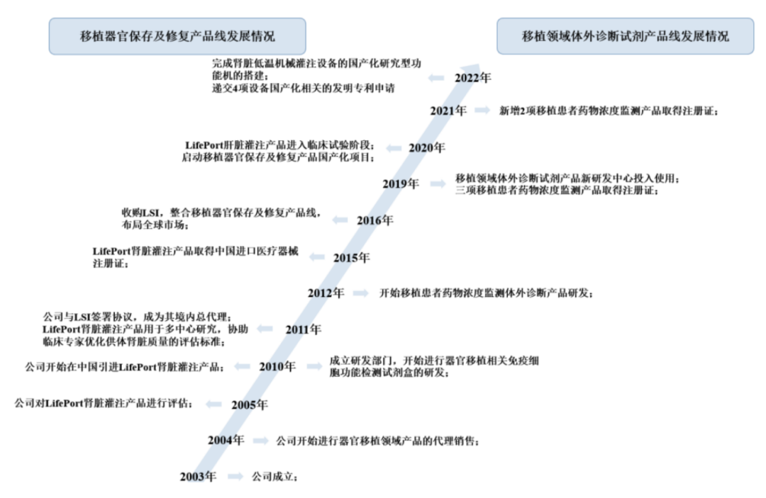 健耕医药成立于2003年,2003-2010年公司主营业务为代理移植领域器械和试剂产品,2010年当年同时成立了研发部门从事移植领域IVD试剂的研发;2016年,公司对海外LSI公司进行收购,获得了器官保存及修复的产品线;2019年,公司多项自研的TDM试剂获得注册证。