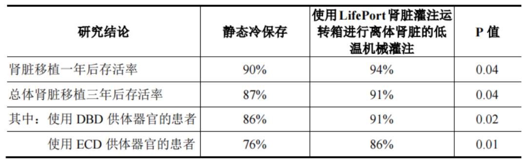 目前,离体肾脏存主要有两种技术路径,分别为传统的静态冷保存、低温机械灌注。刊登在《新英格兰医学期刊》最大的器官机械灌注领域临床研究临床数据表明:相较于静态冷保存,LifePort肾脏灌注运转系统进行低温机械灌注能有效提高移植肾存活率。