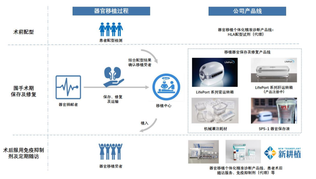 器官移植手术其中会涉及不同的准备工作和阶段,用到的包括术前术后检测IVD产品、器官储存&转运器械产品、抗免疫原性药品等,可以分为三个阶段: