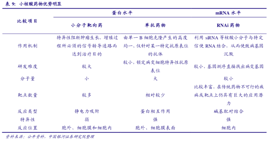 另一值得小核酸药物突出的特点是:任何由特定基因过表达引起的疾病都可以通过小核酸药物进行治疗,这为小核酸药物的研发提供了丰富的候选靶点,特别是针对一些蛋白药物难以成药的一些基因,这无疑将小核酸药物的市场潜力成几何倍数放大。