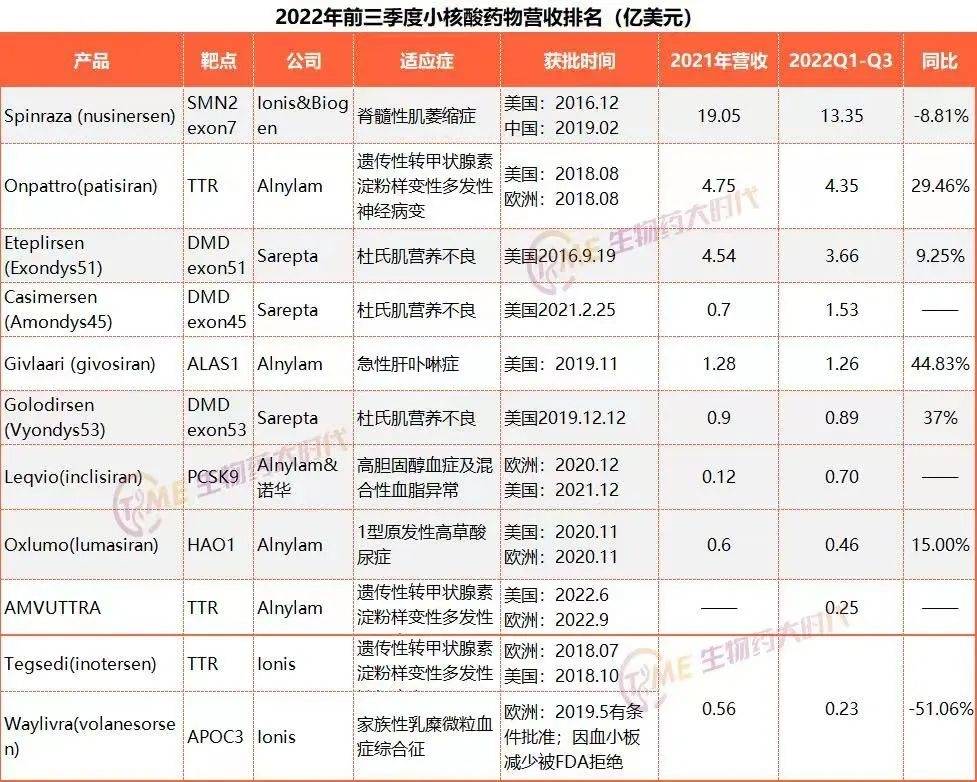 从全球第一个小核酸药物2016年获批以来,7年的时间里获批了11款新药,该领域也出现了超过10亿美元级别的药物 —— 诺西那生钠注射液(Ionis和Biogen合作研发),用于治疗脊髓性肌肉萎缩。同时,大多数已上市品种在2022前三季度出现正向的销售增长,一片欣欣向荣的景象。