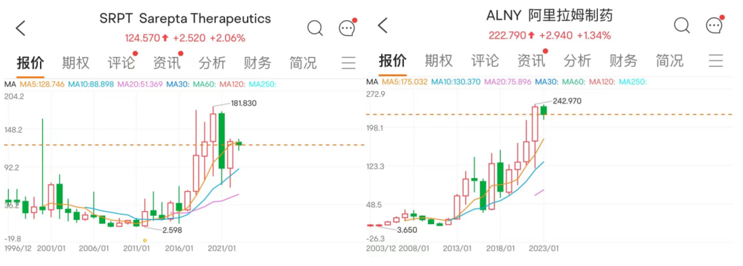 从股价表现看,Sarepta早在1996年登陆纳斯达克,在2016年市值一度跌至不到2亿美元,目前市值高达109.35亿美元;Alnylam则是在2003年上市,从上市时约7.5亿美元的市值一路狂飙到目前的274.09亿美元。