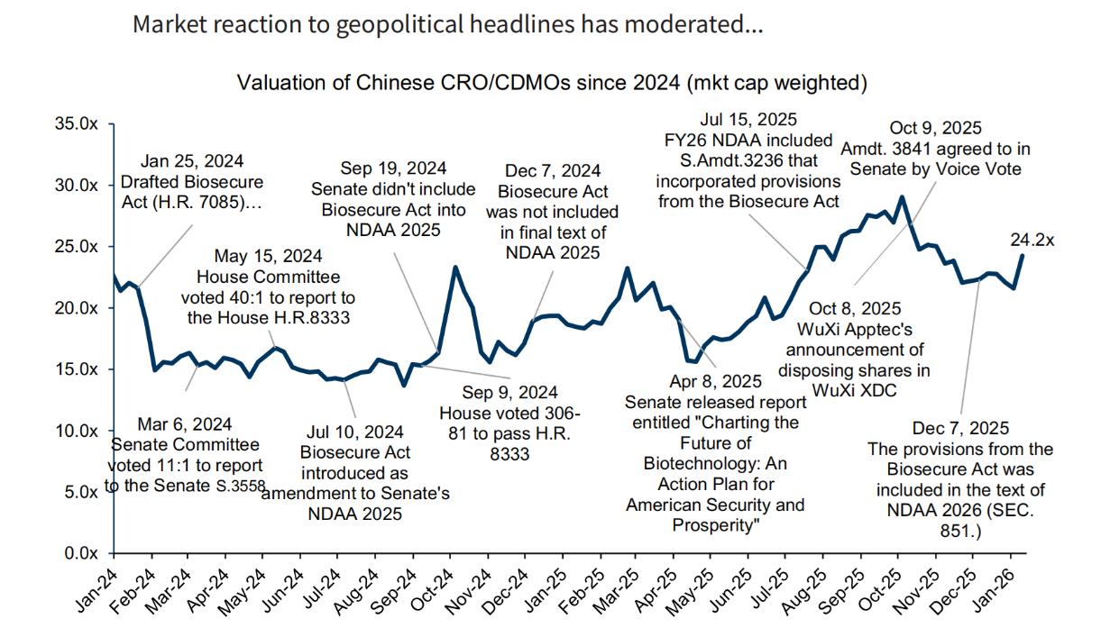 与高盛类似,机构普遍关注到地缘风险对中国CXO企业估值影响的消退。